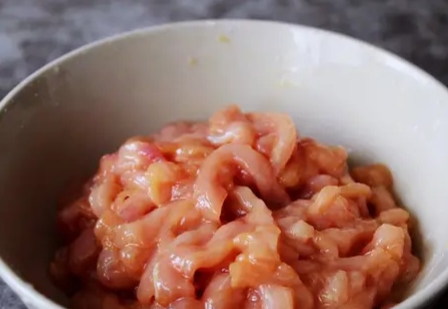 2、接着把肉丝挤干水分,放入容器中,加入盐、鸡精味精和适量清水(水大概十克左右就行),顺着一个方向不停的搅拌上劲(把肉丝拿起来,伸开手掌肉丝粘在手掌慢慢脱落就代表上劲),再放入鸡蛋清和生粉搅拌到肉丝里(这一步是为了让肉丝在后期静放的时候不容易脱水)
