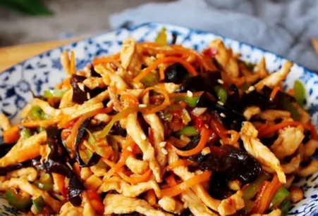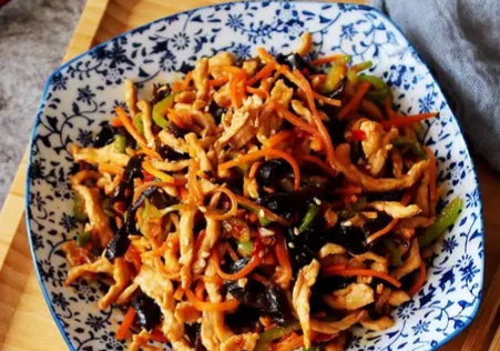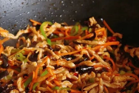 主料:胡萝卜丝五十克、笋丝八十克、瘦肉四十克、木耳丝三十克