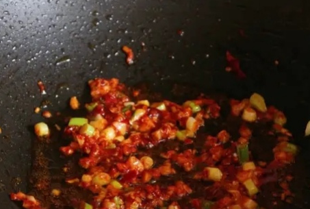 4、锅内放入底油(底油要稍微多一些,这样出锅会更香、更亮),先下入生姜葱煸炒,煸炒到生姜葱在锅内微微变色,然后放入干辣椒(这一步注意油温不能太高,容易把干辣椒炒糊),煸炒到干辣椒香味扑鼻放入豆瓣酱