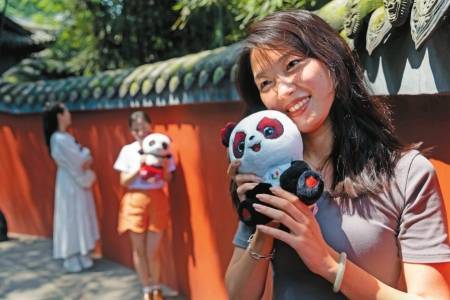 7月19日,游客手捧成都大运会吉祥物“蓉宝”在杜甫草堂的红墙边留影。 新华社发