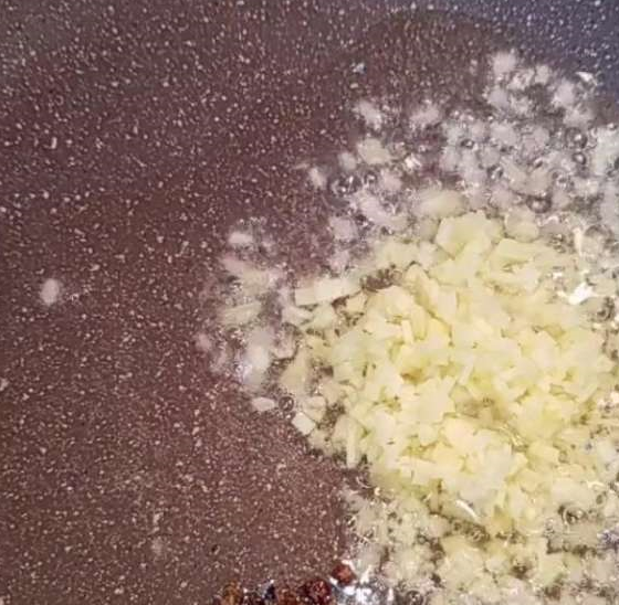 锅中加入油烧热,下入蒜末、花椒粒炒香。
