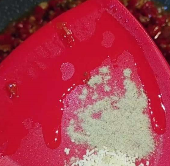 再下入五香粉、鸡精,这个不用加盐的,剁辣椒本身有盐味。