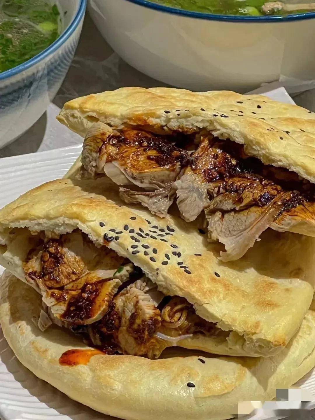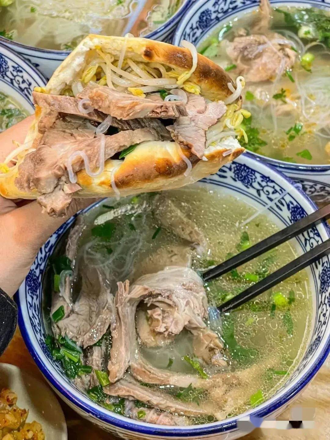 有朋友问我这月牙饼的正确吃法是啥?我仔细思索了一下,似乎吃无定法。当地最为简单的吃法,就是泡馍吃。羊汤烫嘴,拿月牙烧饼来泡,掰一块泡进去,馍刚刚吸收了汤汁就捞入口中,羊汤羊油混在馍中咀嚼,趁着烫激发出饼的香。再就现在流行的吃法,捞出肉、粉丝放入馍中,再将炒好的青椒、腌好的泡菜夹入其中,最后淋上陕西面食灵魂伴侣油泼辣子,趁着辣油还没滴出来,赶紧往口里送,一大口咬下去,荤素碳水齐备,味道浓淡相宜,令人飘飘然。当然也有额外用辣椒酱爆炒的羊肉,夹进去,趁着热汤咥,滋味也是一绝。