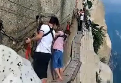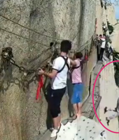 在7月24日,华山的长空栈道上像往常一样有着非常多的游客前来,这是一位穿着灰白色衣服、戴着帽子的男游客在走到长空栈道中间位置的时候,突然从2000米的高空上跳落下去。从监控里的画面我们可以看到,该男子完全就是转身后一跃而下。