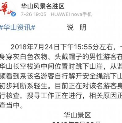 其实对于游客可以自行随意解开身上的安全绳从而转身的跳崖,有的网友说,这华山的安全问题还做得不是很到位啊!对于游客跳崖事情于7月24日的时候发生,到7月26日时候华山方面才发声,华山在对于这件事的处理的速度也令人堪忧啊!其实在于游客的安全保障和后期游客维护的事情上都应该加强管理。