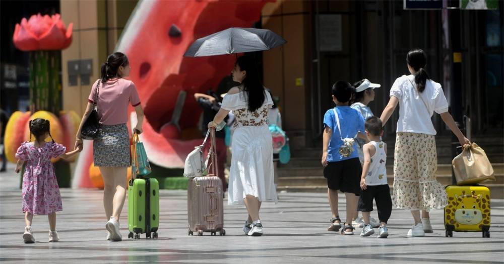 当日是农历大暑节气,市气象台发布“高温橙色预警信号”没能挡住游客的脚步,解放碑步行街仍迎来了众多游客。操着天南地北口音的游客撑着伞、拉着行李箱,在烈日下打卡重庆。记者 张锦辉 摄/视觉重庆