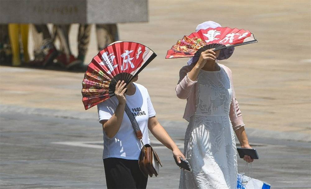 ▲7月23日,解放碑步行街,游客拿着“重庆”字样的扇子遮阳。