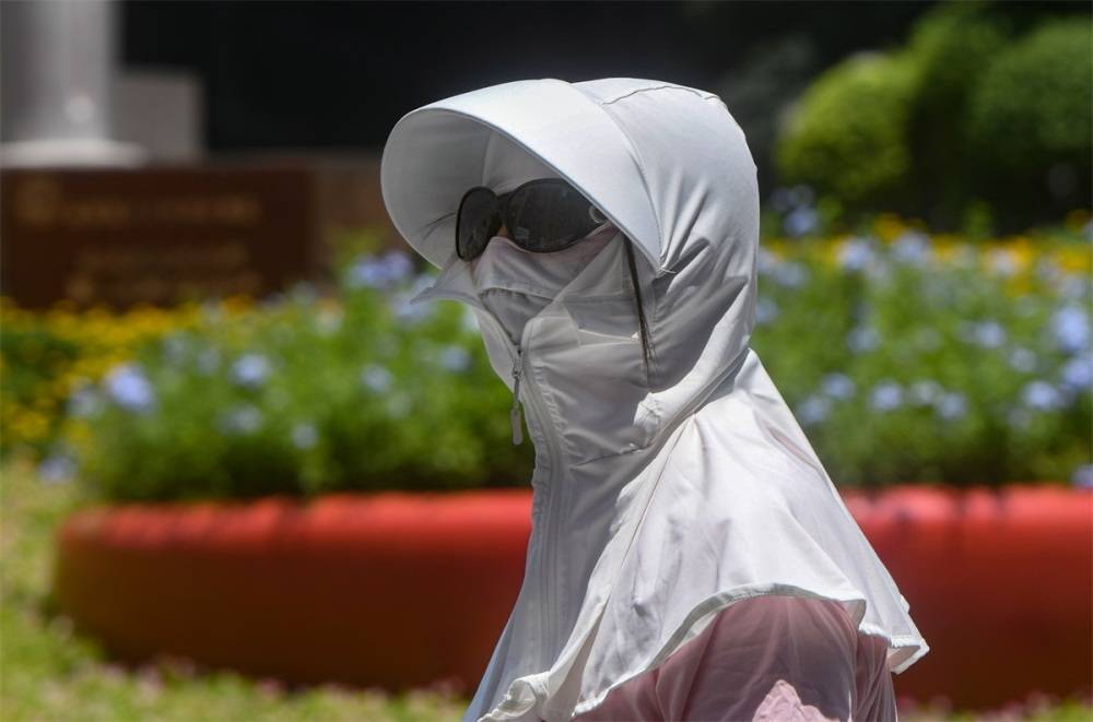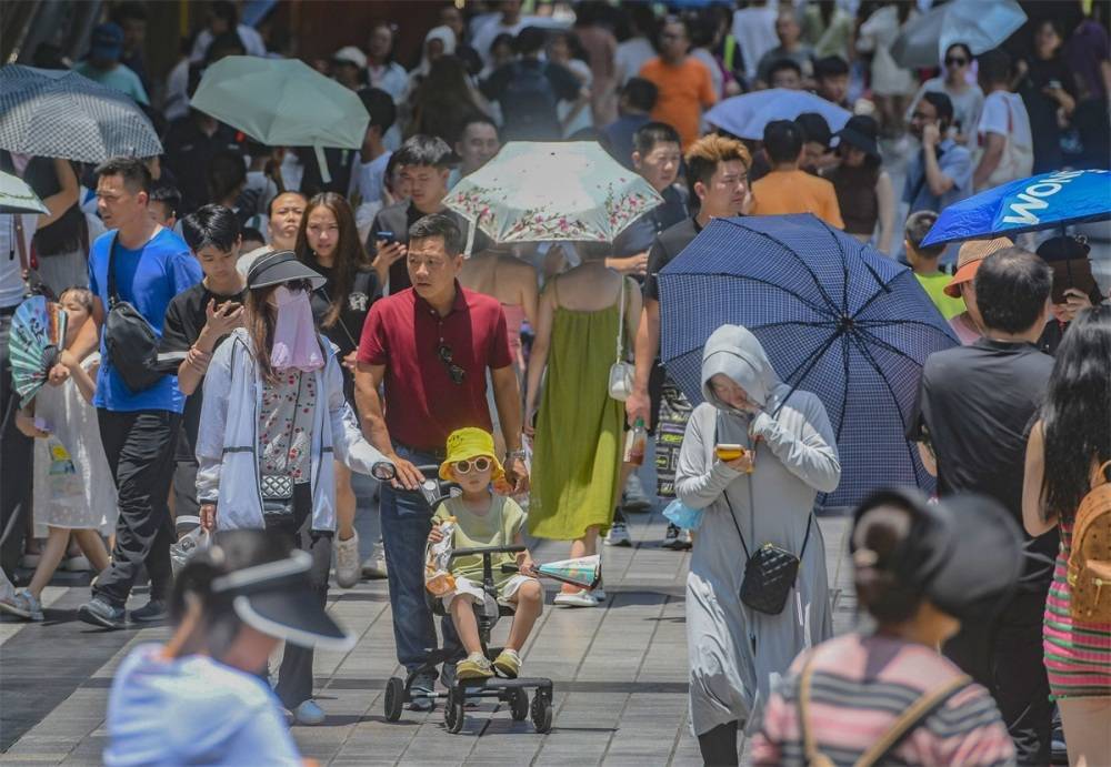 ▲7月23日,众多游客全副武装行走在解放碑步行街。