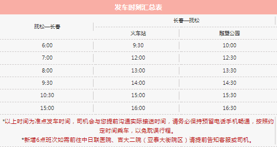 为方便乘客就医需求,从4月8日起抚松至长春增加早6:00班次,途经长春世界雕塑园、中日联谊医院、吉大二院(亚泰大街院区)、吉大一院、长春火车站