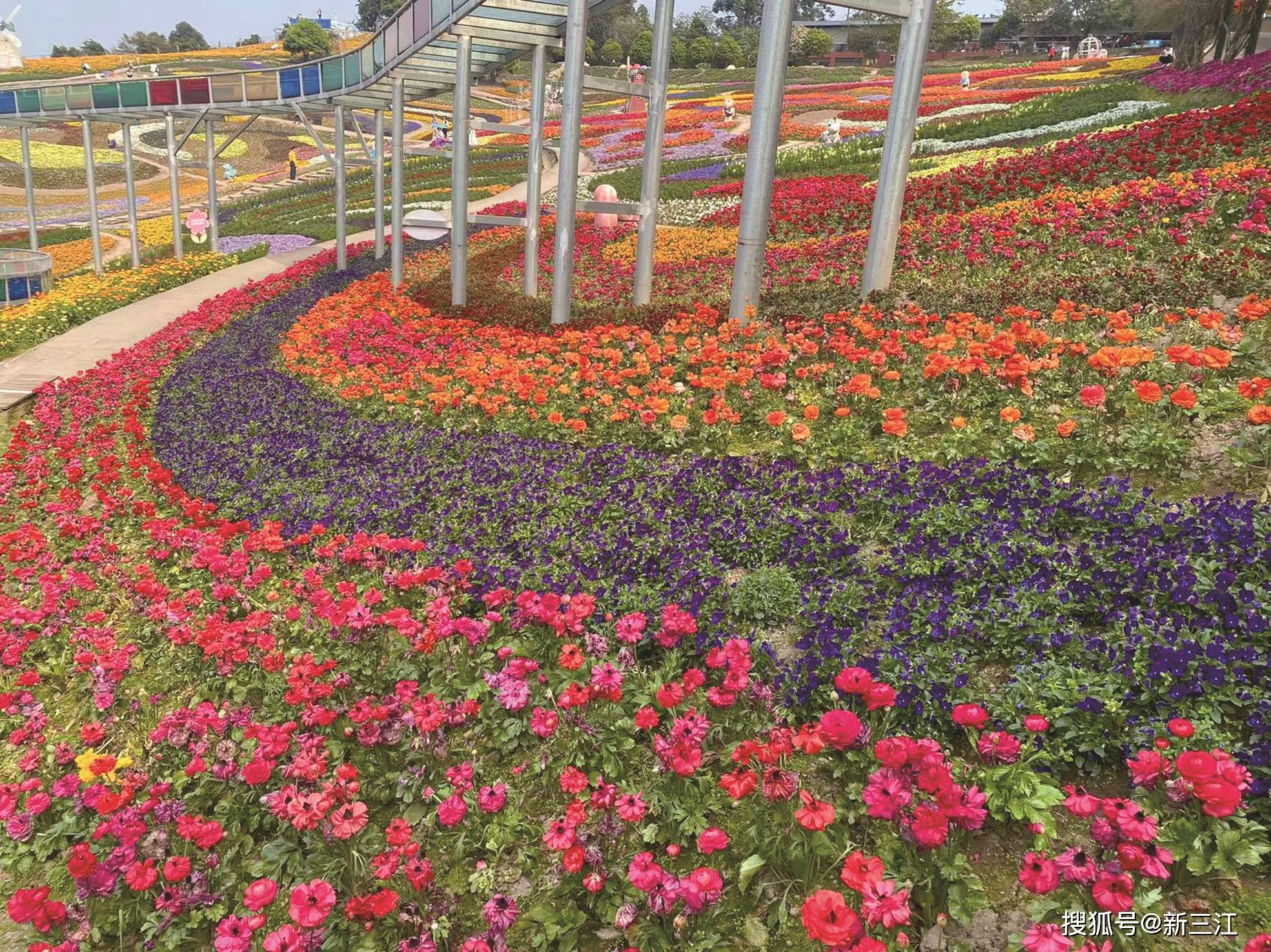 花海里游人如织,四处可见拍照留影的人,想留住眼前的春色。年轻人们举起自拍杆,在花丛中定格自己的笑颜。孩子们也找到了乐趣,嬉笑着追逐飞舞的蝴蝶,往花丛深处去。为了更好地留住客人,景区还在花海中布置了巨型风车、大熊猫等造景,以及彩虹桥、丛林探险等游玩项目,吸引不少孩子来“打卡”。