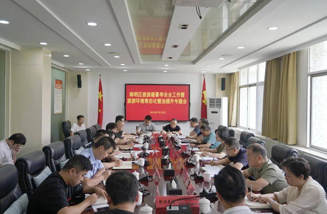 7月23日,南明区召开旅游避暑季安全工作暨旅游环境常态化整治提升专题会,强调要深入学习贯彻习近平总书记对旅游业发展的重要指示精神和视察贵州重要讲话精神,严格按照省、市关于避暑季相关工作的部署要求,紧盯旅游服务质量提升,进一步加强安全秩序管理、环境卫生整治,全面提升甲秀南明旅游形象,提高游客的体验感和舒适度。