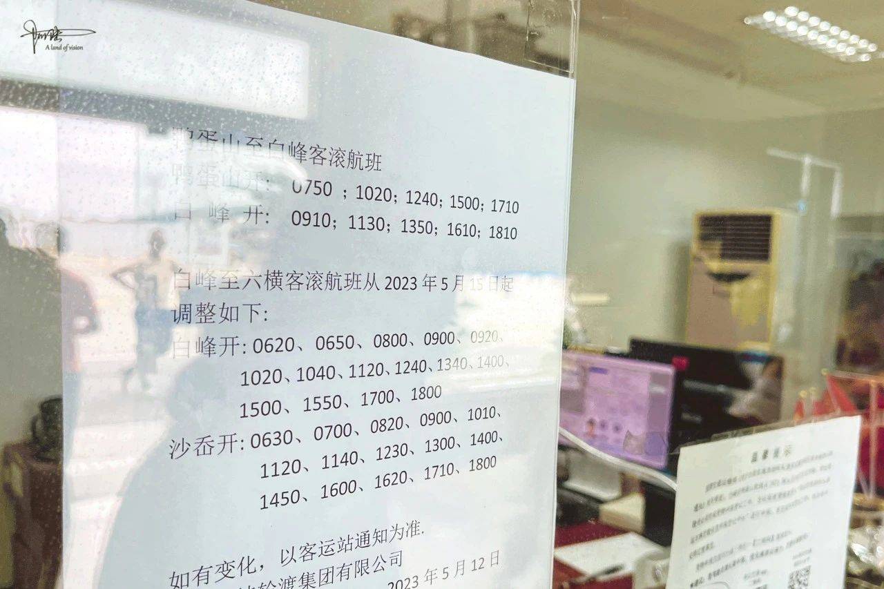 不过凭身份证购票时才知道,现在的白峰码头轮渡班次很少,跟网上各种攻略或者咨讯“吹嘘”的一天几十班或者四十分钟一班有很大出入。在我仔细询问下得知,当天(周日)的真实情况是“上午两班、下午三班”。因为海上交通受天气变化的影响很大,所以这只是我自己的亲身经历,给大家做个参考,附张随手拍下的班次表。话说票价是真的便宜,连人带车只要30元哦!
