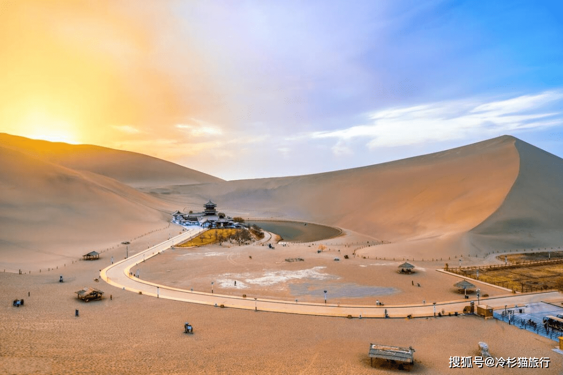 爬上鸣沙山沙丘顶上可以俯瞰月牙泉,夏、秋两季在此欣赏日出、日落,视野中的地平线被染上绚烂的金色,西北大漠的苍凉广阔尽收眼底。