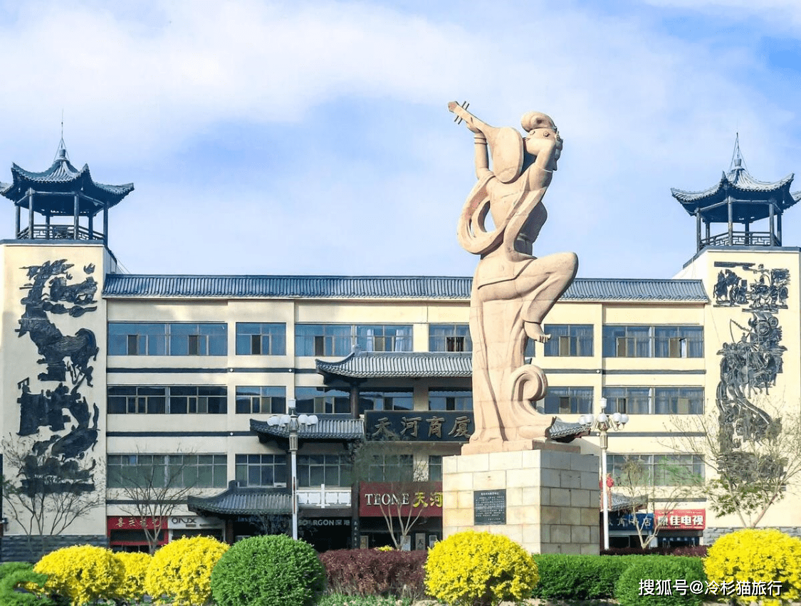 敦煌的母亲河党河,被打造成了一条“党河风情线”。党河又将敦煌市区一分为二,沙州路和阳关路交叉口的反弹琵琶雕像是这里的中心。