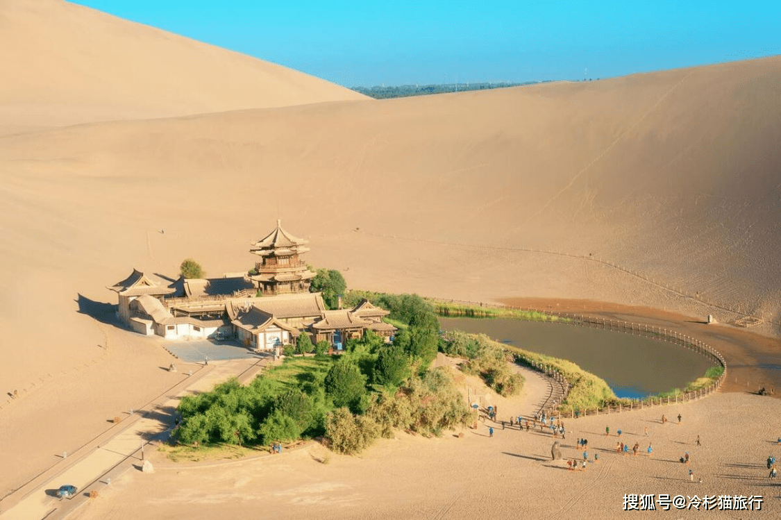 月牙泉被鸣沙山环抱,因水面酷似一弯新月而得名,这是鸣沙山景区最著名的地方。