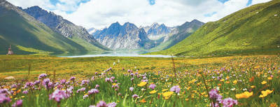 五彩斑斓的野花肆意绽放,碧蓝的湖水倒映着雪峰,山间雾霭缭绕,如同世外桃源。云在空中凝固,经幡迎风起舞,和着草原上的群鸟鸣叫,让人忍不住赞叹大自然的绝妙。