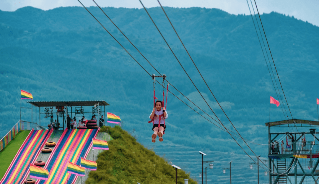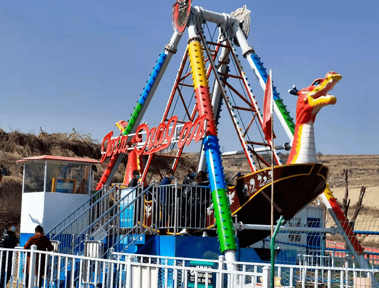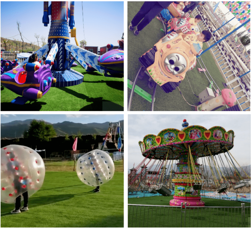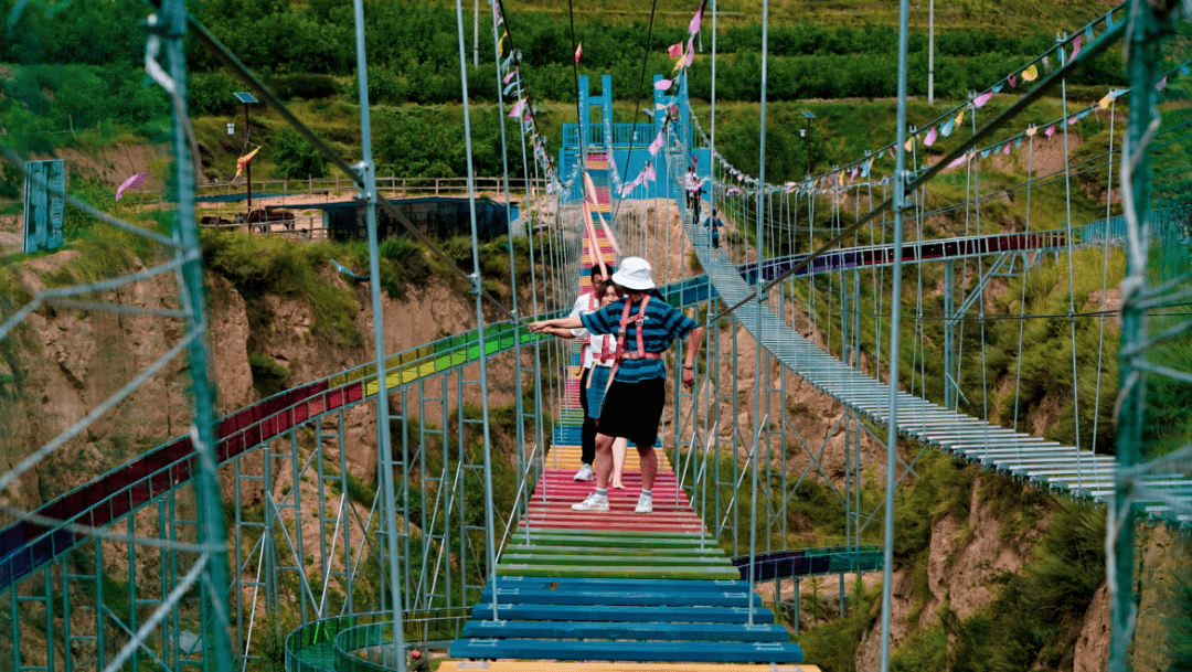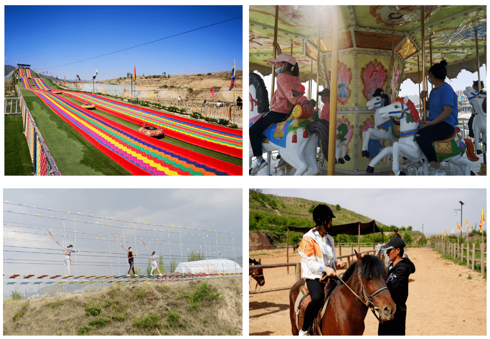 走出美食街,民俗演艺广场的北边,是大型游乐园。幸福摩天轮、惊险大摆锤、高空漂流、步步惊心、峡谷飞索、跑马场、网红桥等好玩的项目真的超级多,如果觉得这些项目太刺激,那旋转木马、自控飞机、大金刚、青虫滑行车、海盗船等项目,非常适合亲子游打卡。