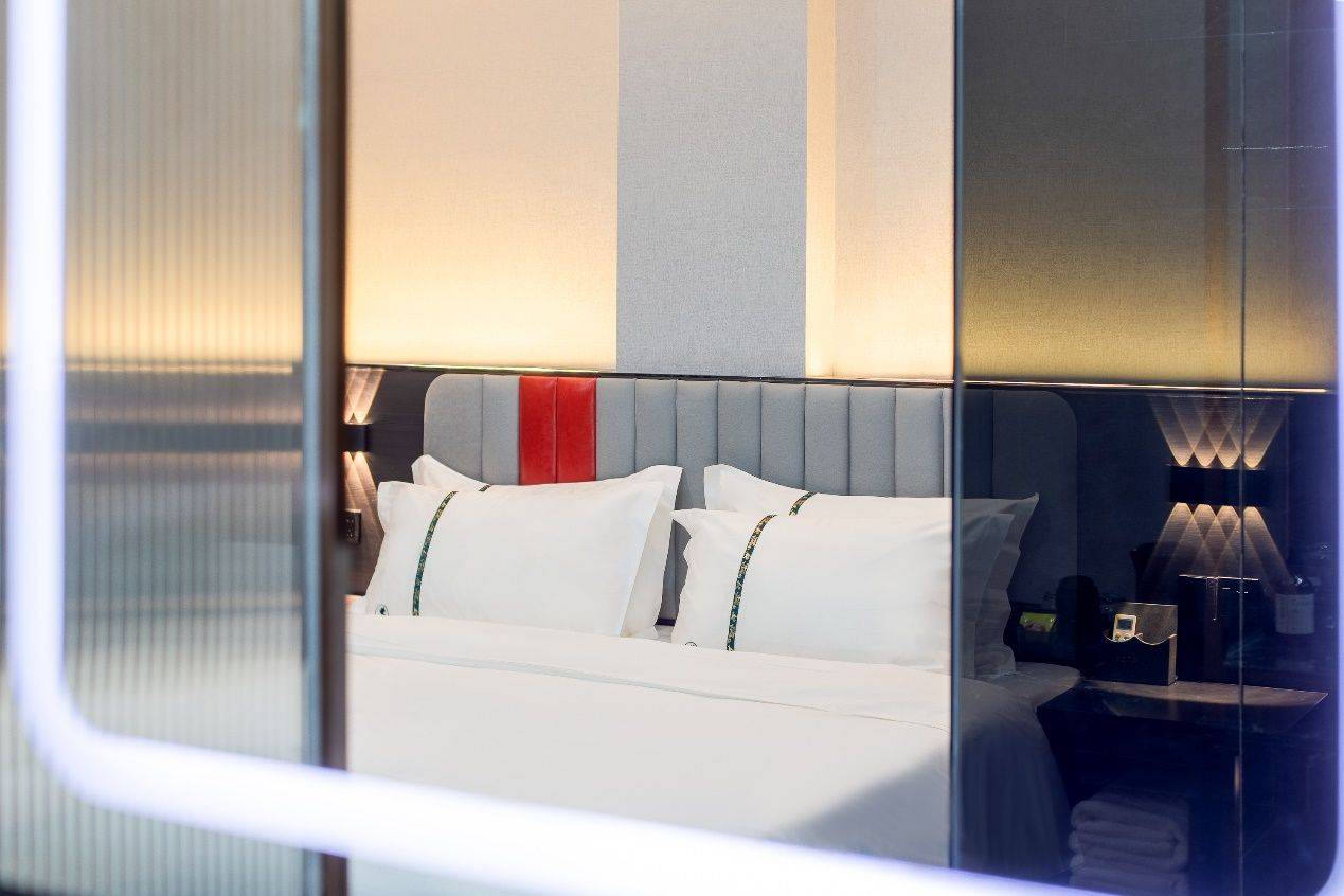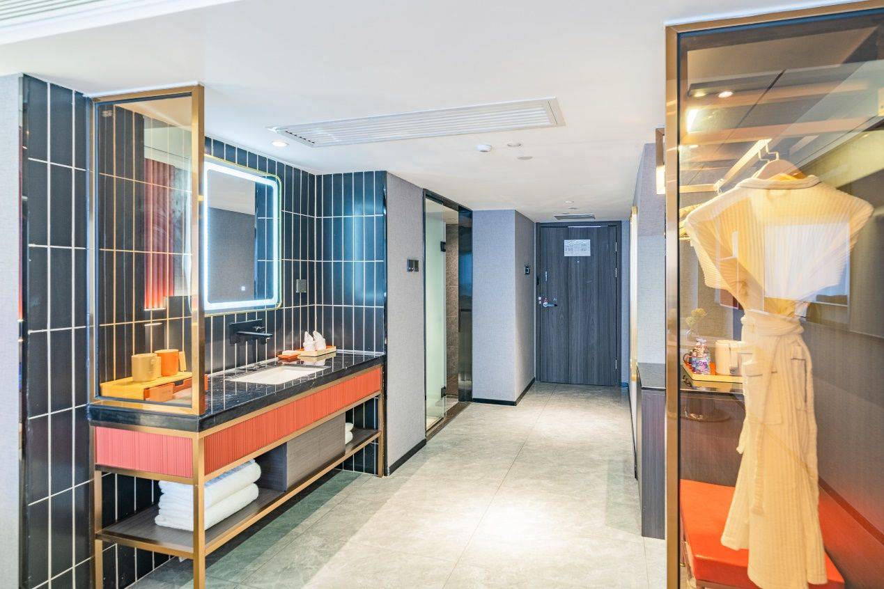 以南宁季枫酒店为例,客房采用深灰、橘红、金属色、橙色、中国红等多个颜色相互搭配,打造了独特的酒店视觉审美,突出酒店年轻潮流的整体风格和品牌调性。