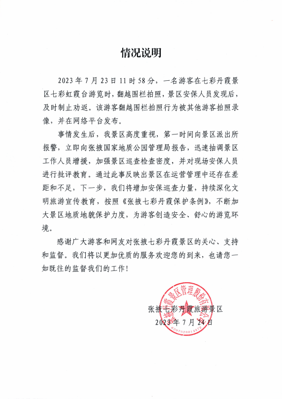 张掖七彩丹霞旅游景区发布情况说明:2023年7月23日11时58分,一名游客在七彩丹霞景区七彩虹霞台游览时,翻越围栏拍照,景区安保人员发现后,及时制止劝返。该游客翻越围栏拍照行为被其他游客拍照录像,并在网络平台发布。