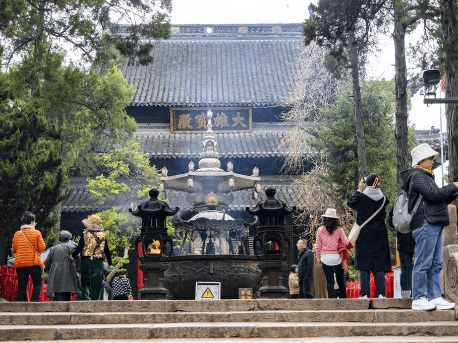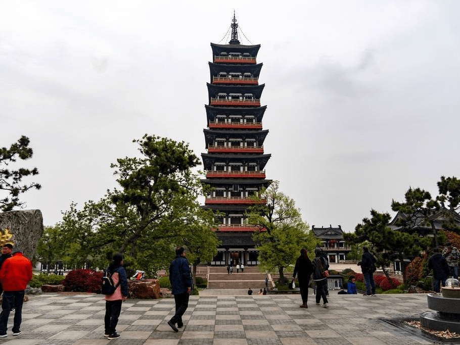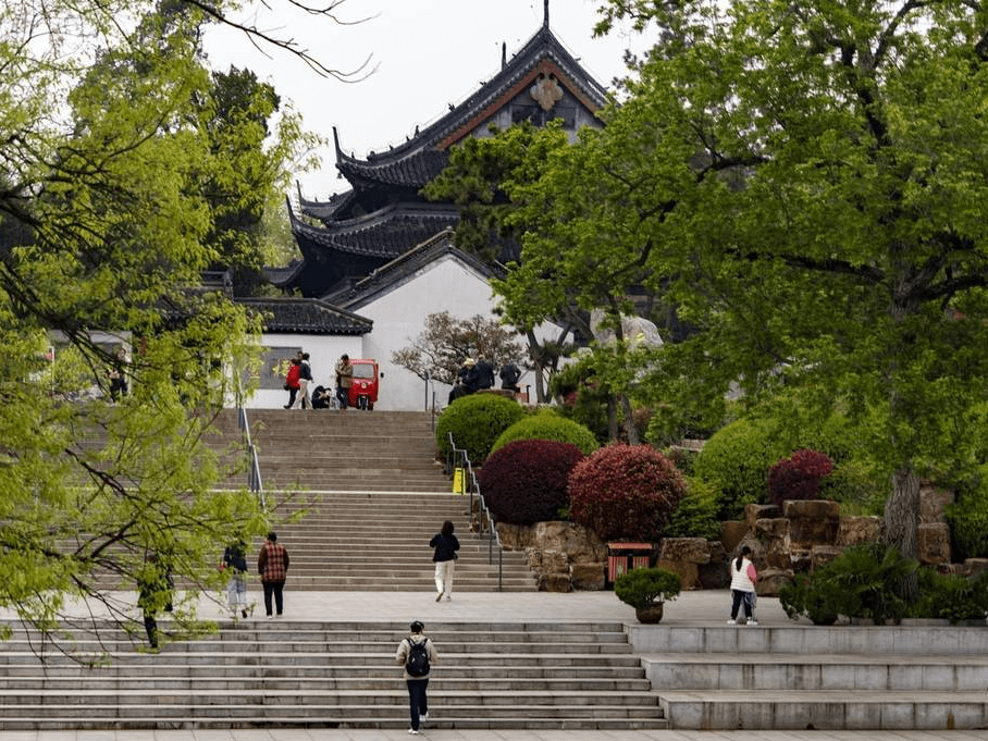 来到江苏省扬州市的大明寺,许多游人云集这里,欣赏观光。
