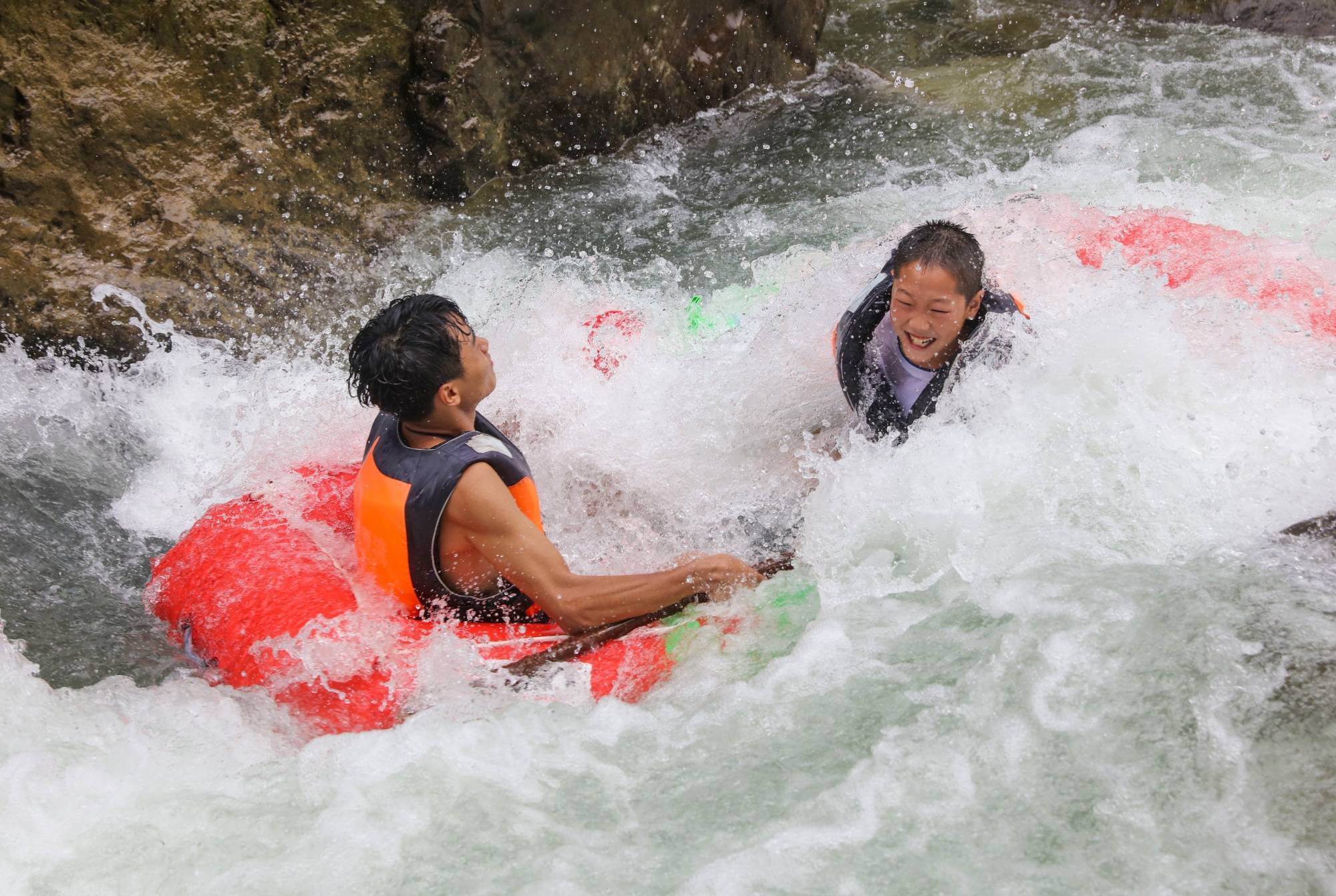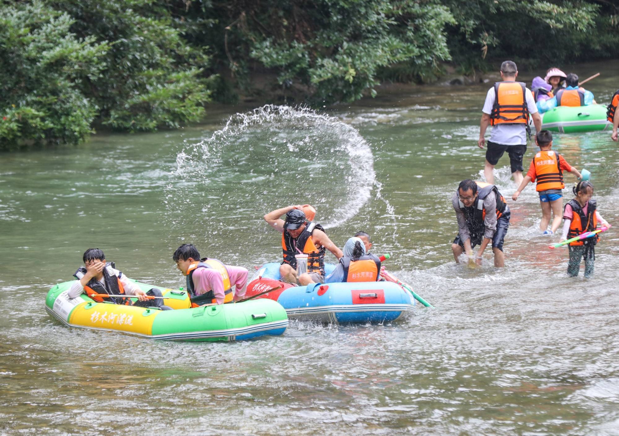 盛夏时节,贵州省黔东南苗族侗族自治州施秉县杉木河景区漂流迎来高峰期,省内外游客纷纷前来漂流休闲,在青山绿水间放松心情,享受凉爽。