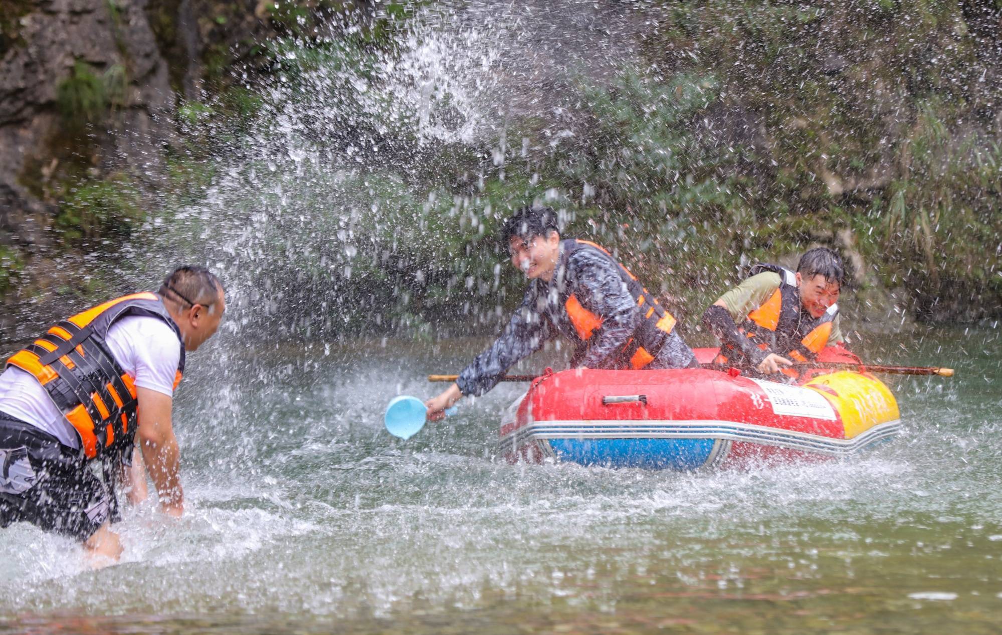 游客们在青山绿水间享受漂流(磨桂宾)