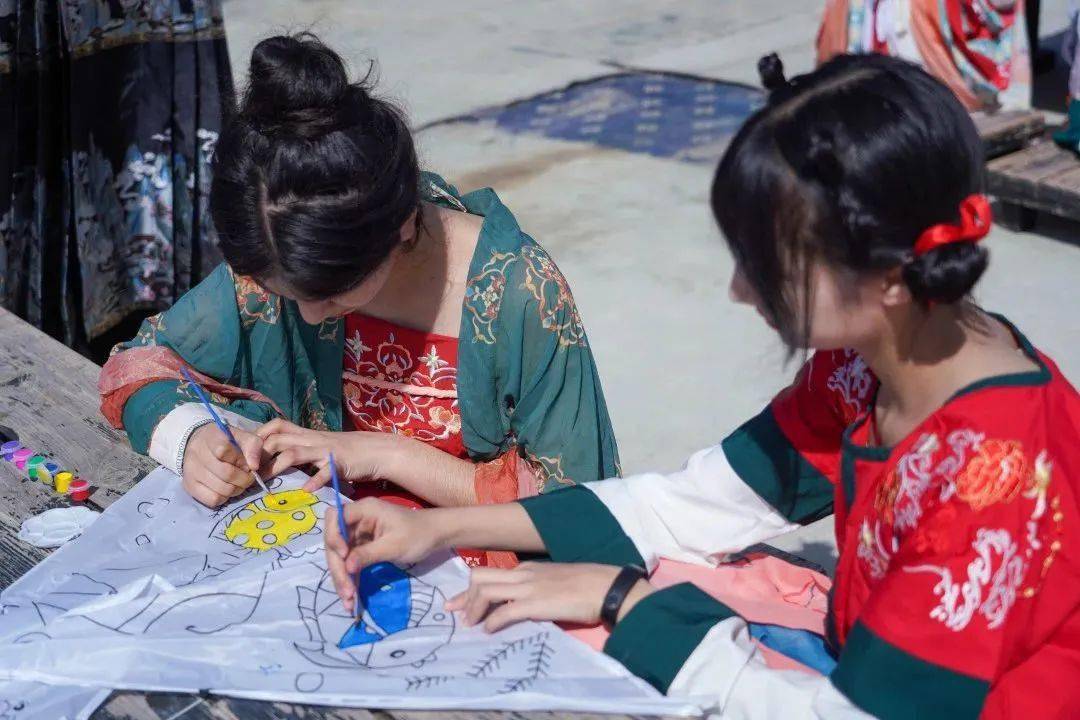 天上的风筝争奇斗艳,地上风筝彩绘也精彩纷呈。