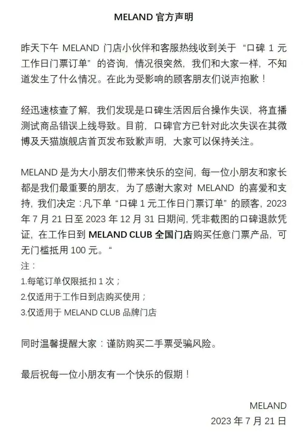 在表达歉意的同时,MELAND还决定:凡下单“口碑1元工作日门票订单”的顾客,2023年7月21日至2023年12月31日期间,凭非截图的口碑退款凭证,在工作日到MELANDCLUB 全国门店购买任意门票产品,可无门槛抵用100元。