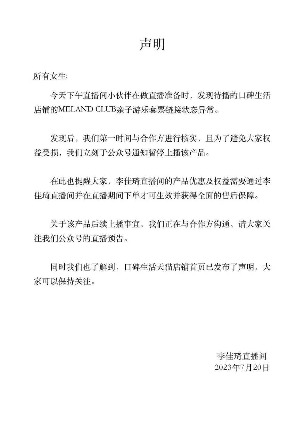 7月20日晚,李佳琦直播官方微博对此事发布声明。详情如下: