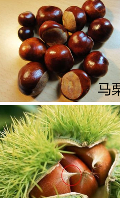 但是还有一种方法是比较容易辨别的,就是两种栗子的形状完全不一样,马栗的形状非常圆,整个都是圆滚滚的;而板栗是属于半球形的,通常有一面是平的,所以两者的差异非常明显,比较容易区分,新手一样可以分清楚。板栗用来吃,但马栗一般是用来做游戏玩conker,还能挂在窗口门用来驱赶蜘蛛。