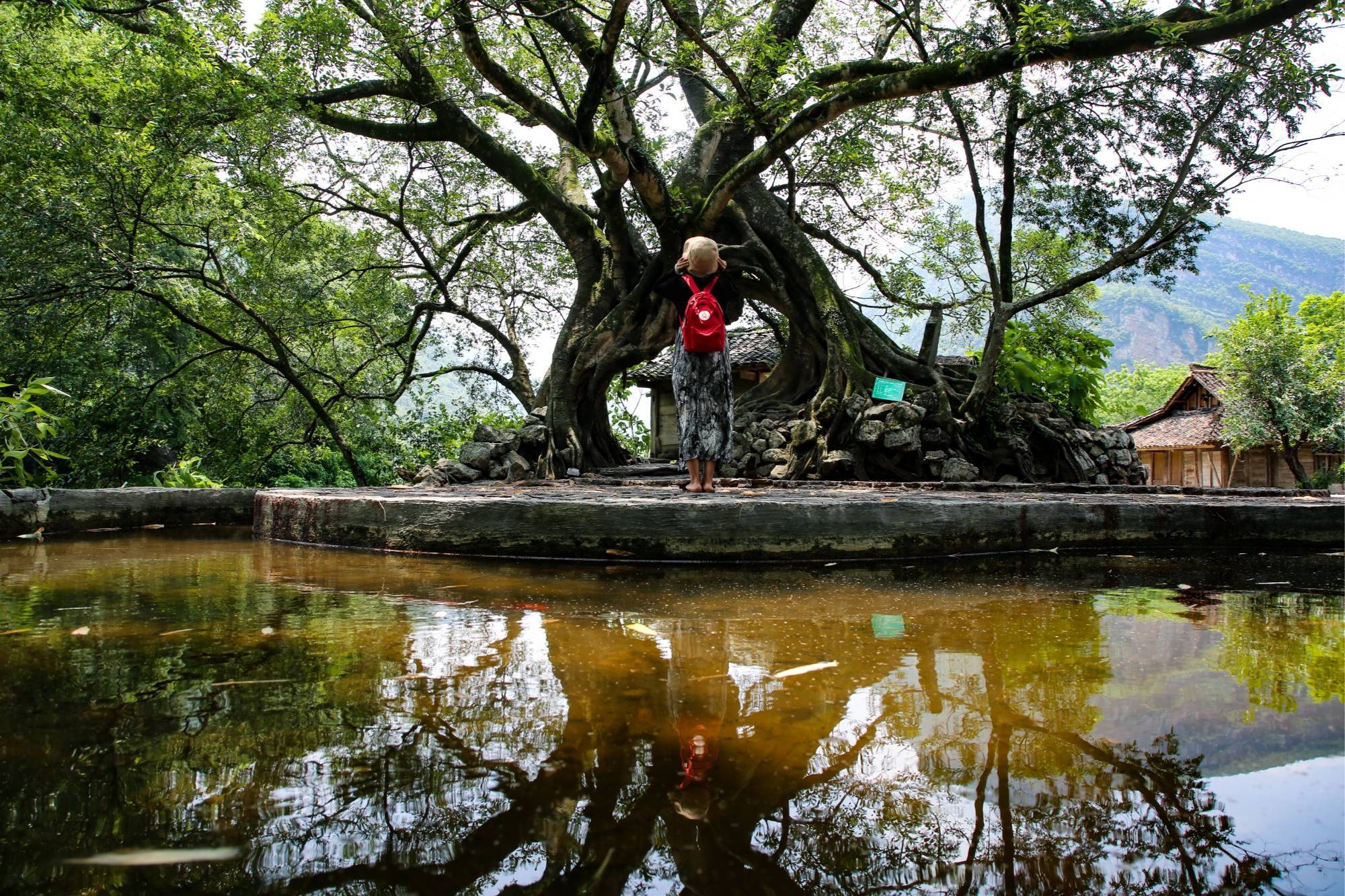 游客在六盘水市水城区花戛乡天门村鸳鸯树下(赵桦 摄)