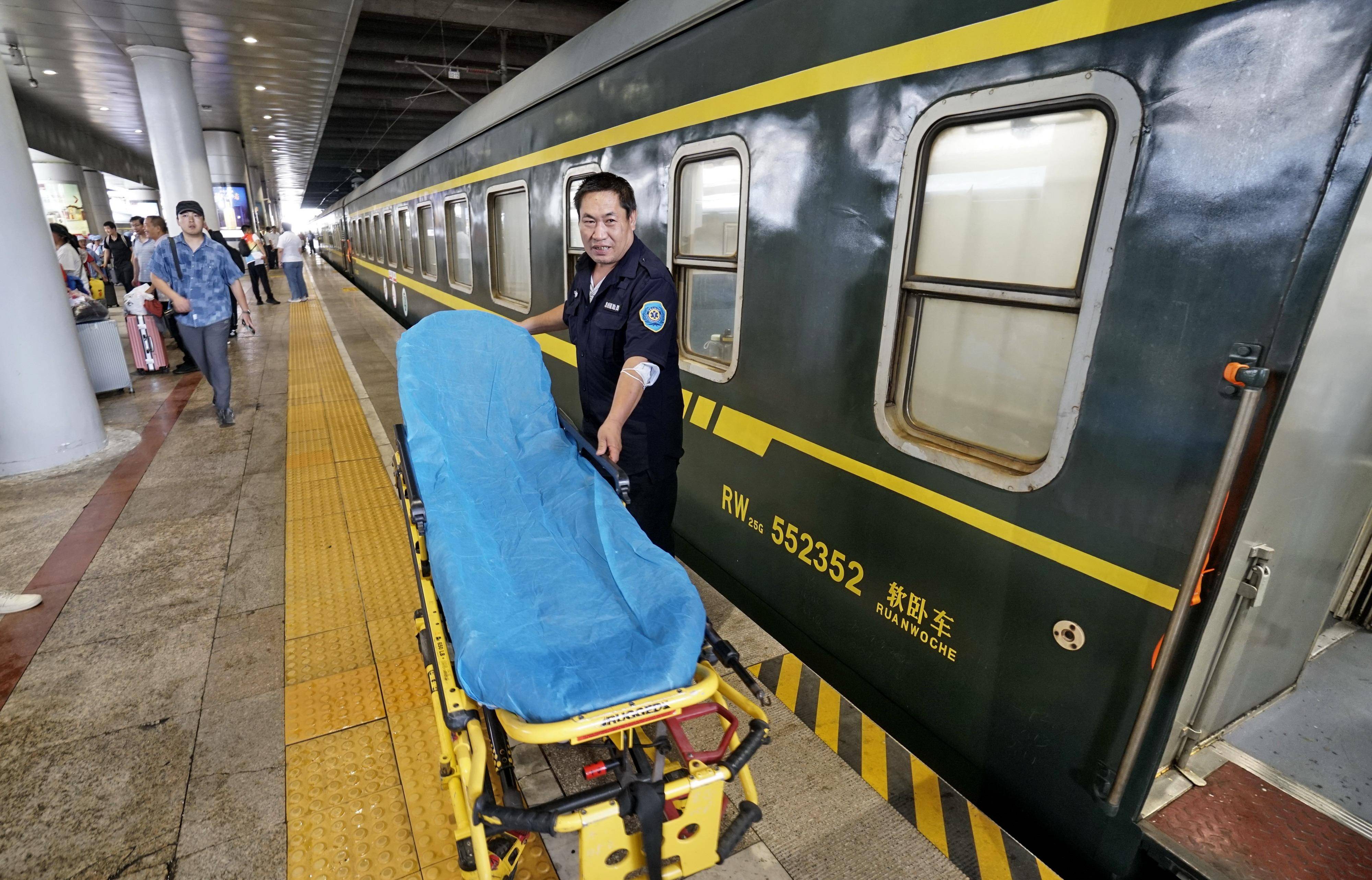 7月24日,旅游专列的医护人员将医疗设备运上列车。 新华社记者 李欣 摄