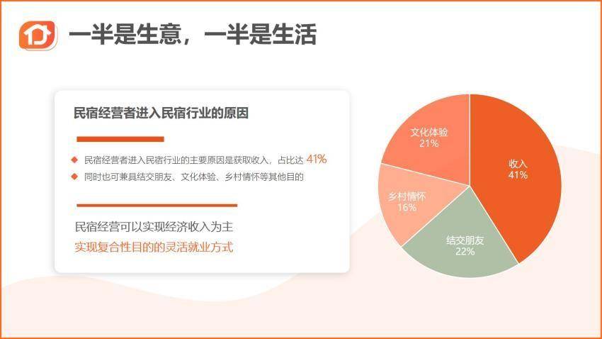 途家民宿首席商务官刘杨表示:“投身民宿行业的人,或多或少有一些浪漫主义精神存在,他们追求一半是生意、一半是生活的工作方式,在获取收入目的外,也可以兼具结交朋友、文化体验、乡村情怀等。途家民宿希望发挥平台优势,帮房东们把这项事业长期经营下去,在获取经济收入同时,为住客提供更深入的住宿体验。”