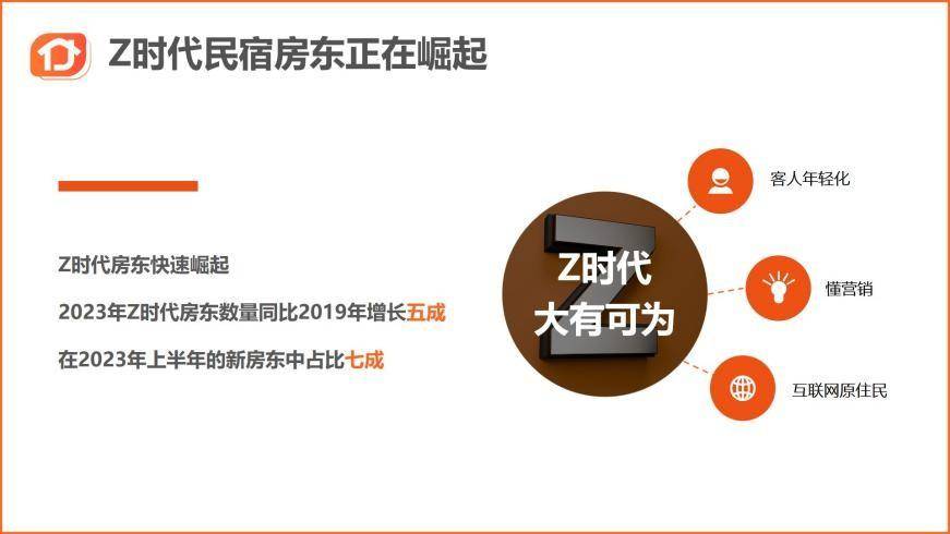 近年来,民宿行业发展火热,越来越多的人加入到民宿行业中。7月24日,途家民宿召开媒体沟通会,途家首席商务官刘杨在会上发布了《Z时代民宿从业者观察报告》(以下简称“《报告》”)。报告显示,2023年上半年途家平台新增房东中Z时代(“95后”)房东占比达七成,同比2019年增五成。对他们而言,这不仅是一次就业、创业的机会,也收获灵活社交与表达个性的空间。
