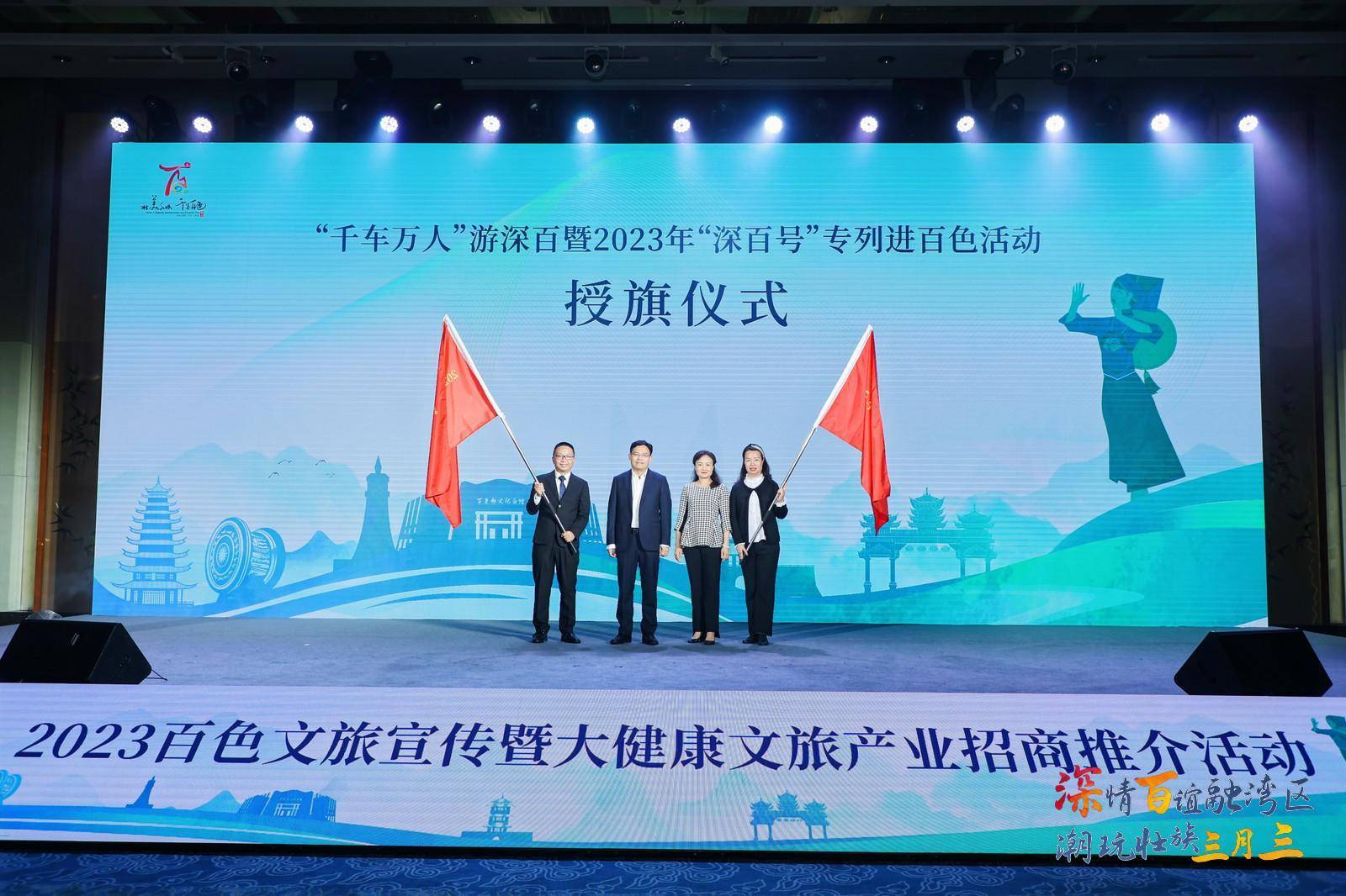 活动现场,百色市委常委、宣传部部长赖荣生,深圳市文化广电旅游体育局二级巡视员杨永群共同向深圳市旅游协会、百色城投集团授旗,“千车万人”游深百暨2023年“深百号”专列进百色活动正式开启。届时,将有大量游客在广西“壮族三月三”节日期间以自驾或乘坐“深百号”旅游专列向百色出发,实地感受“壮美红城 千姿百色”的风尚魅力,亲身体验粤桂协作下“老区+特区”对口合作的新风貌。