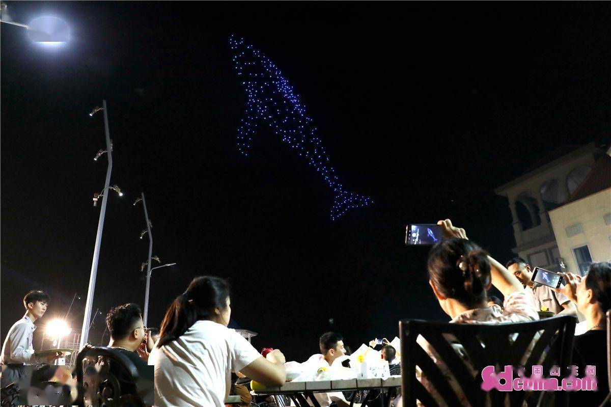 7月22日,在山东省青岛西海岸新区红树林度假世界,游客边就餐边观看无人机表演。