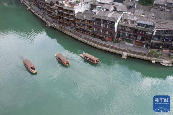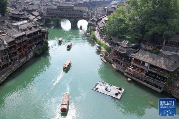 炎炎夏日,各地游客在凤凰古城泛舟游览,欣赏古城美景,感受民俗风情。