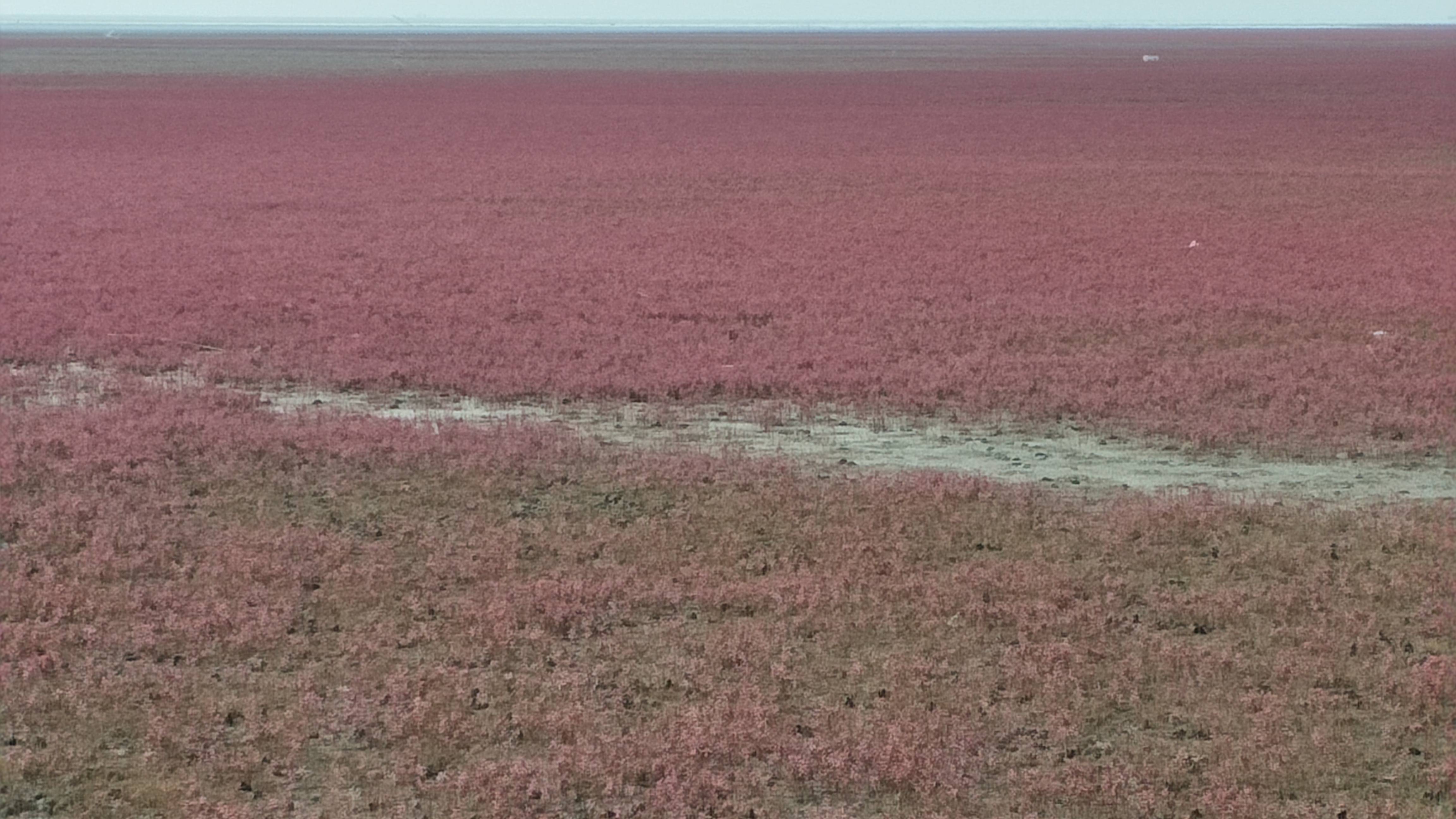 据介绍,红海滩,不是红色的沙滩,而是近海由连成一片的一株株小草而成,草叫碱蓬草,是唯一一种能在这种地质环境盐碱地存活的草,每年四月长出地面,初为嫩红色,逐渐转深,深秋十月转为最艳丽的深红色,成为了世界上独一无二的红海滩美景。红海滩景区也不叫“景区”,叫“廊道”,到实地一看,就是修一条道路深入海滩,道路两边都是滩涂湿地,只有这条道路可以行车走人,名符其实的“廊道”。