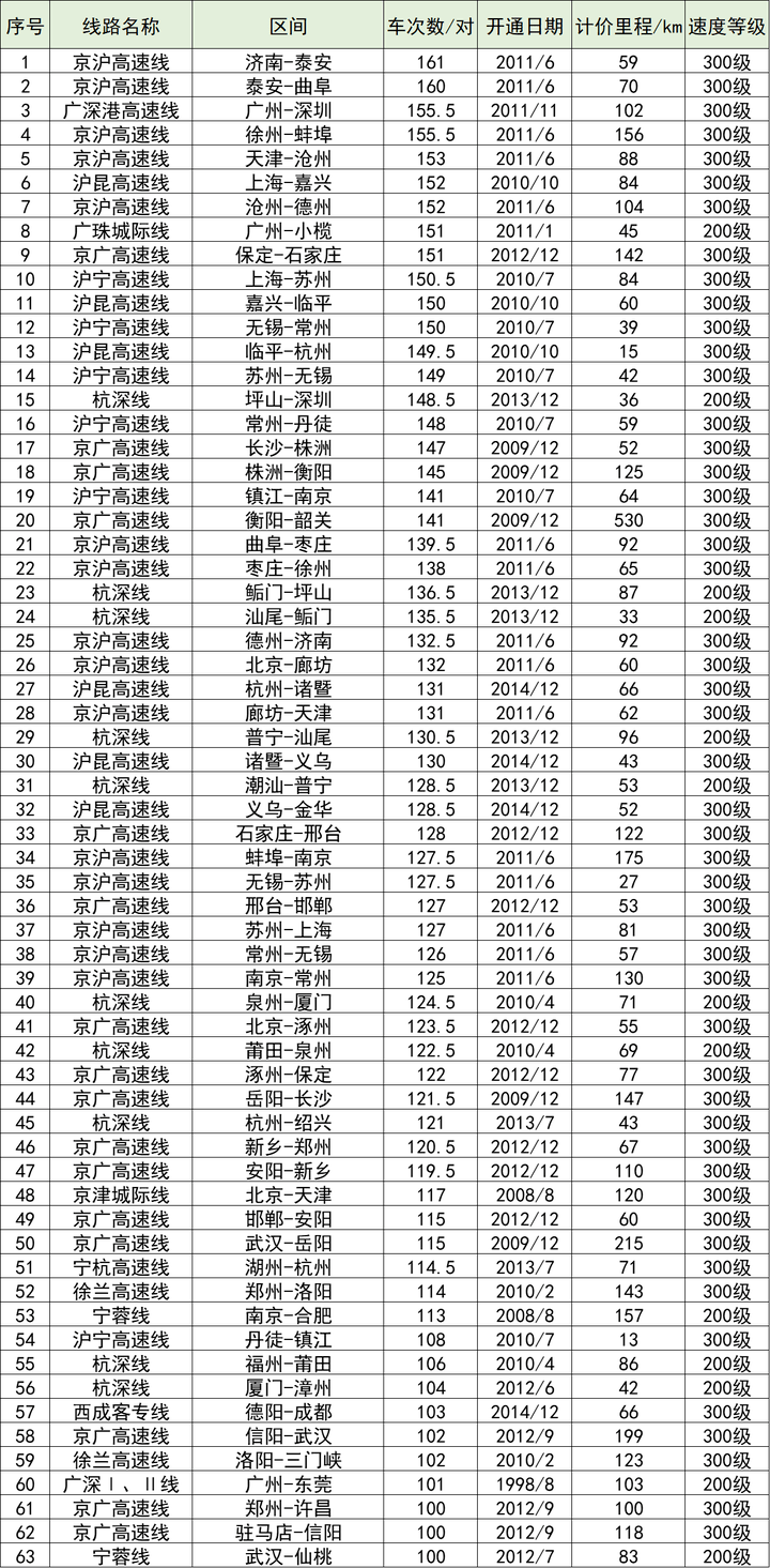 100对以上车次的高铁线路 来源:轨道城市
