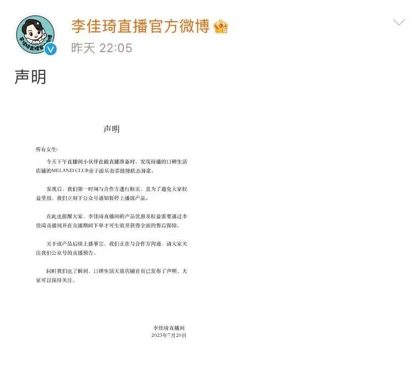 随后,口碑生活服务旗舰店在店铺首页贴出致歉信,声称原计划在7月20日晚的直播间设置100份Meland club游乐福利,用0.1元的价格秒杀售价298元的(一大一小)工作日门票。提前对秒杀链路进行测试时,出现了操作失误,导致很多朋友看到了测试商品,并能够下单购买。