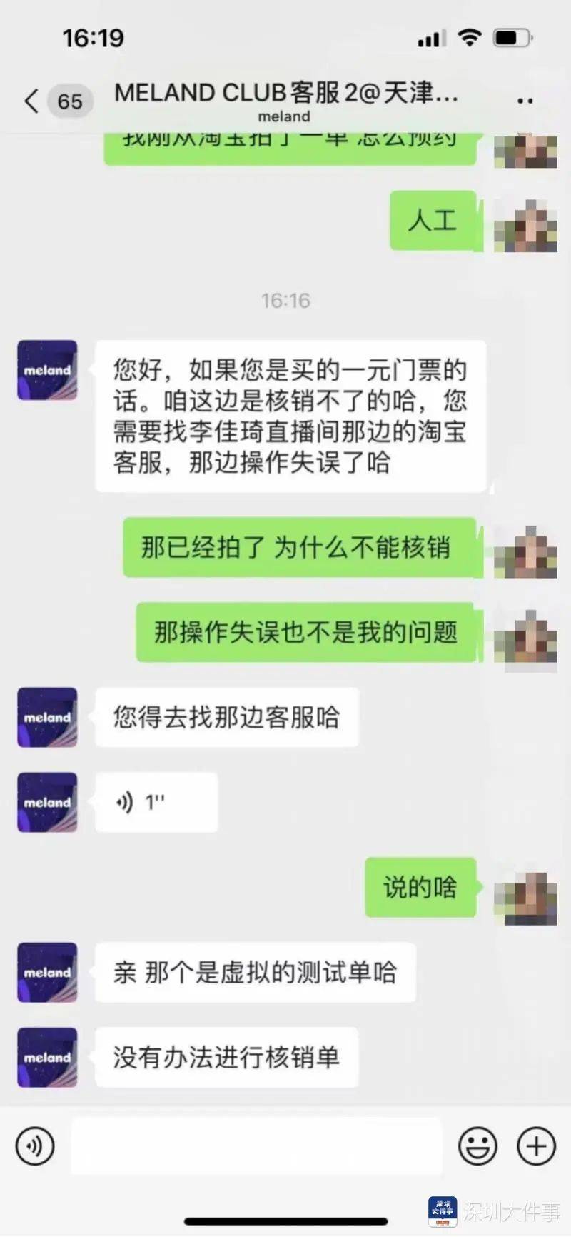 有人找MELAND CLUB客服咨询预约事宜时,被告知无法核销,因为购买的是虚拟测试单,需要找到李佳琦直播间的淘宝客服处理。