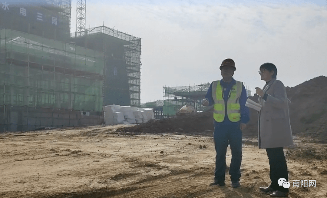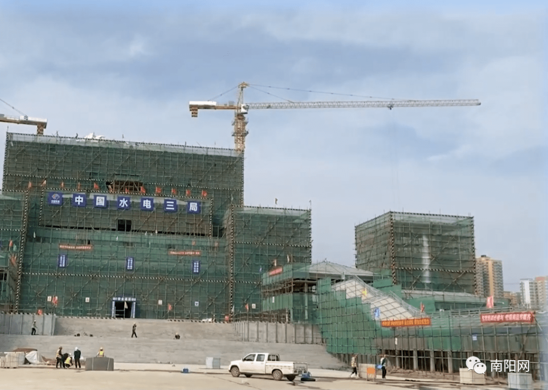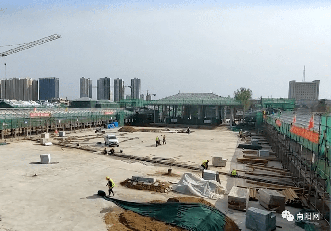 穿过纪念碑亭,走过大堂行医馆,便步入了60米长、60米宽的医圣广场。它是文化园中轴线上一方开阔的广场,未来,仲景文化相关活动都会在这里举办。广场桥上,数名工人正在进行伸缩缝施工,还有工人拉着建材石板走过、工具车辆拉着建材驶过;四面绿色的安全网内,虽看不清人影,却听得见各种机器的作业声。