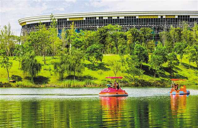 7月24日,垫江县东部新区三合湖湿地公园,市民戏水玩耍,好不惬意。