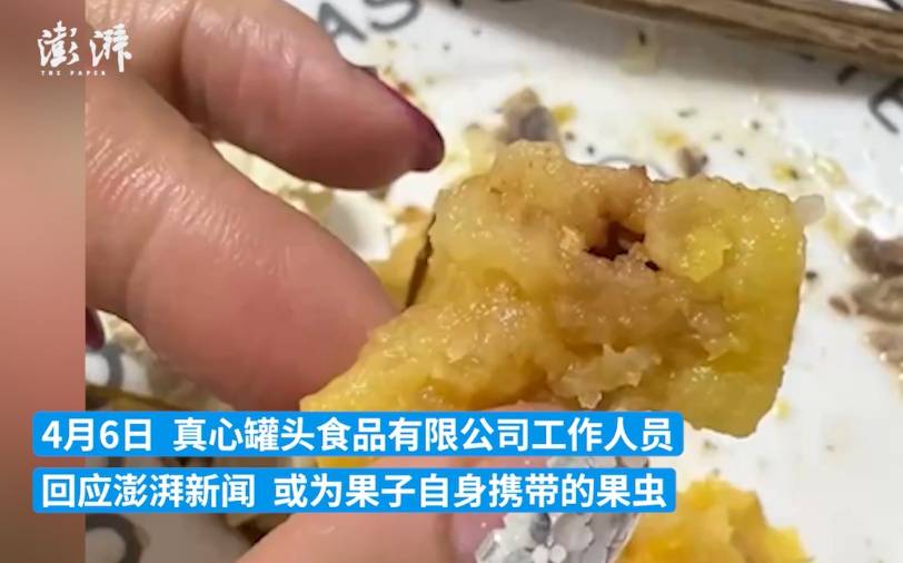 4月6日,真心罐头食品工作人员回应称或为果子自身携带的果虫。“那应该是果虫吧,那确实抱歉了。那可能就是说这个应该是果子里面自身携带的虫子,应该是有这个人工进行挑选的,因为它毕竟藏在里面嘛,可能说看不太出来。”