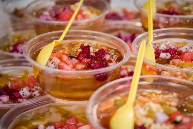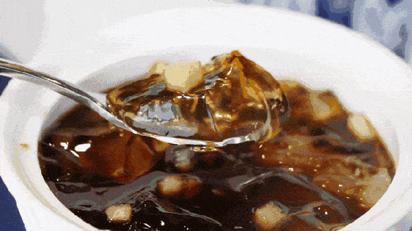 冰粉是很传统的西南地区消夏甜品,过去的手搓冰粉是用冰粉籽做的,学名叫酸浆果,夏天开花,秋天结实。做法是取冰粉籽,细纱布裹好,浸入水中,反复搓,至出浆,然后加凝固剂,冷却后就成了果冻一样的固体,晶莹透亮,滑滑嫩嫩。现在的冰粉一般是用冰粉籽兑出来的,一小包可以兑出一大锅。冰粉的标配是红糖水,还可以加各种配料,如糍粑、芝麻、葡萄干和鲜水果。