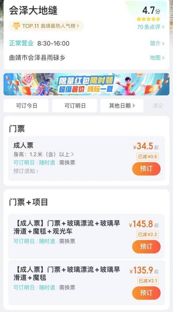 订票网站显示,会泽大地缝门票价为34.5元,票价为145.8元的套票中包含门票、玻璃漂流、玻璃旱滑道、魔毯、观光车等项目,票价为135.9元的套票中包含门票、玻璃漂流、玻璃旱滑道、魔毯等项目。