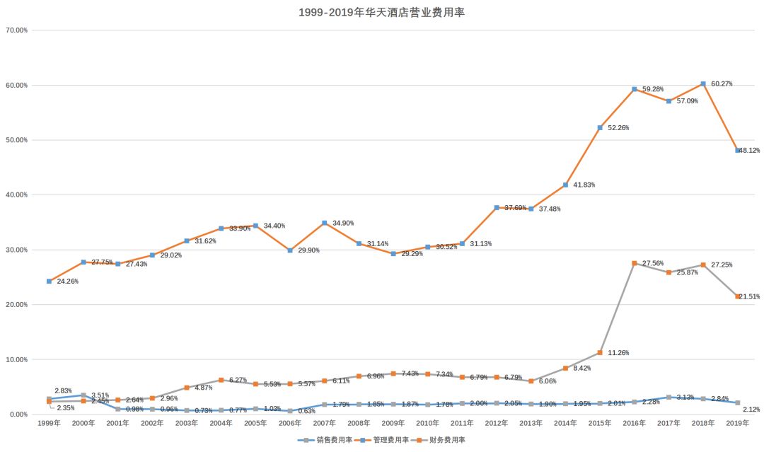 长期以来,华天酒店的酒店业务毛利率和综合毛利率始终稳定保持在60%左右和50%以上,公司品牌美誉度、市场地位并未发生变化,而财务费用率和管理费用率却在2014-2019年间大幅攀升,严重“侵蚀”了利润空间。