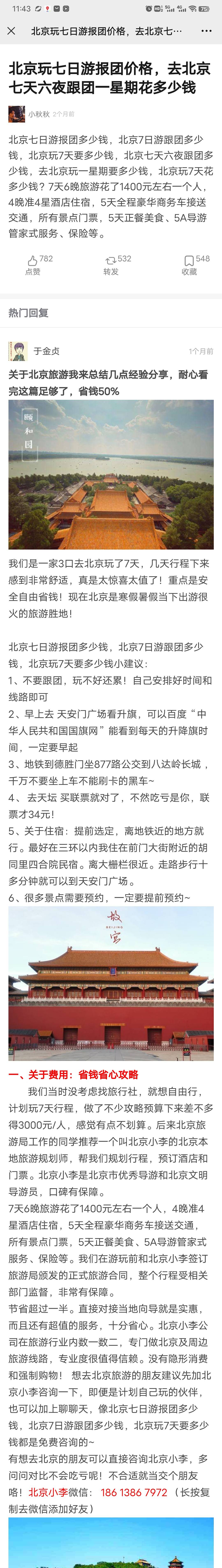 今年年初和朋友去的北京,在去之前,我们在当地的旅游网上找到当地排名靠前的引导人小李帮我们安排的,一路线下来很轻松,玩也玩好了,吃也吃的尽兴,很完美的一次旅游。下面是小李的炼习访试,感兴趣的可以问他详细的行程。