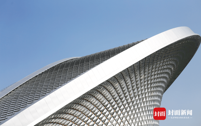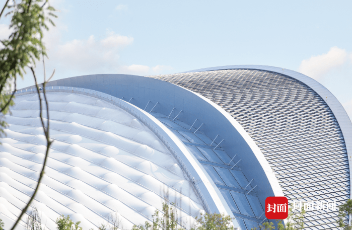 佘念说道,当俯瞰或遥望之时,便能看见一座“川剧凤冠”般的建筑,立于城市之中。近看时,主舞台幕墙使用的单元式铝板材料密密排布,像极了凤冠上镶嵌的宝珠;而当夜幕降临时,通过泛光设计,它们又与凤凰羽毛有着八分神似,在夜晚的城市熠熠生辉。