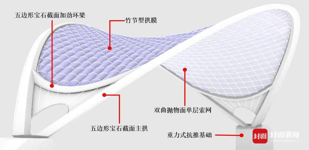 此外,主舞台上用作于撑起成都最大穹顶天幕的相关应用是国内首例的双斜拱承双曲抛物面索网结构,这对主舞台呈现出的“建筑力学之美”起到了关键性作用。